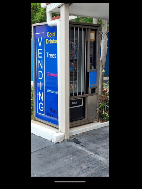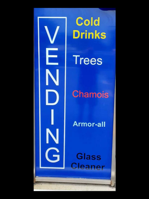 Inside our vending machine, you’ll find the now-famous “Little Trees” interior fresheners, Armour All vinyl protection, window cleaner, bug and tar remover, tyre shine and chamois along with cold soft drinks and water.